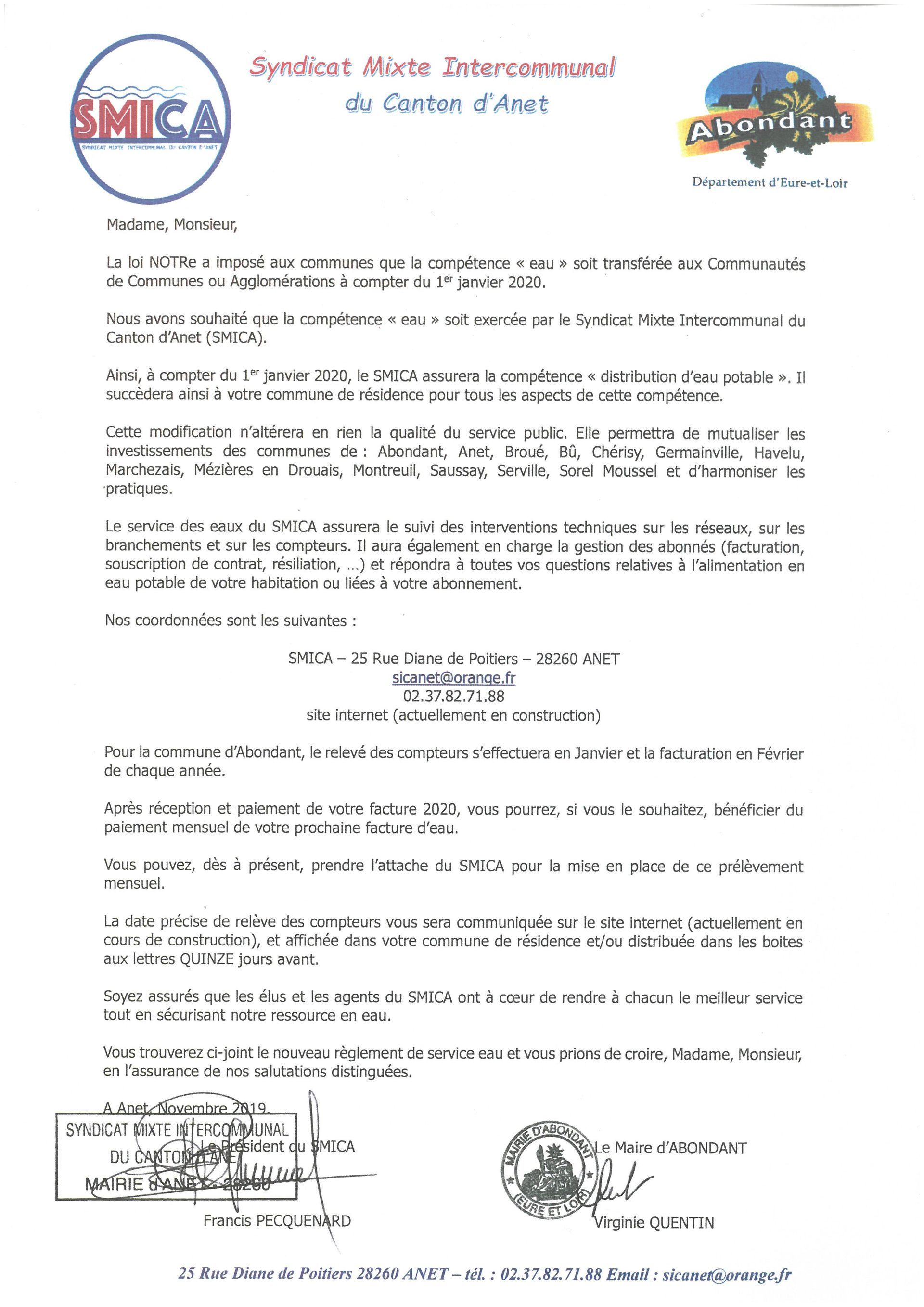 Depuis le 1er janvier 2020, la compétence "Eau" a été transférée aux Communautés de Communes ou Agglomérations, comme imposé par la loi NOTRe. Votre mairie a souhaité que la compétence "Eau" soit exercée par le Syndicat Mixte Intercommunal du Canton d'Anet (SMICA).